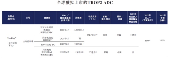科伦博泰的核心产品之一SKB264是一种靶向晚期实体瘤的新型TROP2 ADC。截至最后实际可行日期,吉列德科学的Trodelvy 是美国唯一获批适用于晚期TNBC、晚期UC以及HR+/HER2- BC的TROP2 ADC,也是唯一获国家药监局批准用于晚期TNBC的TROP2 ADC。