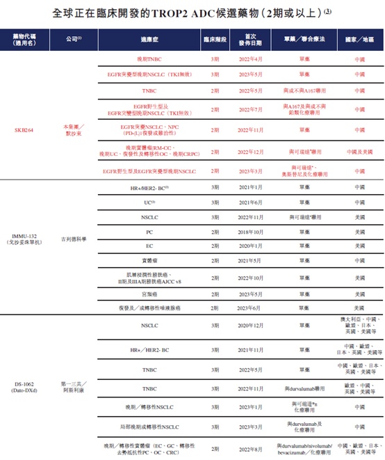 全球范围内共有三款TROP2 ADC候选药物处于2期或以上阶段,包括SKB264、Trodelvy (药物代码为IMMU-132)及DS-1062。