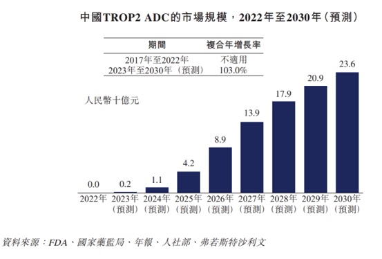 伴随着全球TROP2药物的开发,其市场空间将迎来爆发式增长。根据沙利文报告显示,2022年全球TROP2 ADC市场为7亿美元,并预期由2022年起按复合年增长率57.6%增长至2030年达到259亿美元。在中国,2022年国家药监局批准首款TROP2 ADC Trodelvy后,中国的TROP2 ADC市场预期由2023年起按复合年增长率103.0%增长,2030年将达到236亿元。