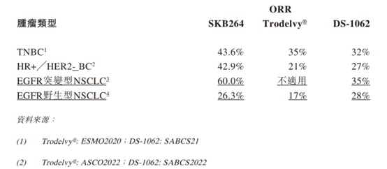 不仅如此,SKB264全球1/2期的初步临床试验数据令人鼓舞。数据显示,SKB264在既往接受过多重治疗的TNBC、 HR+╱HER2- BC及NSCLC患者中,ORR分别为43.6%、42.9%及43.6%。并且还展示出了潜在的良好安全性。