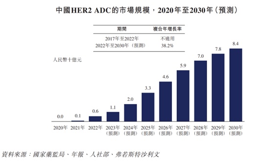 尽管中国已有三款HER2 ADC(赫赛莱®、爱地希®及Enhertu®)在中国取得批准,但其治疗效果仅限于少数HER2+实体瘤患者,市场对用于扩大晚期HER2+实体瘤患者的治疗选择的差异化HER2 ADC仍存在需求。根据沙利文报告显示,2022年中国HER2 ADC的市场规模为6亿元,预计2030年增至84亿元,自2022年起的复合年增长率为38.2%。