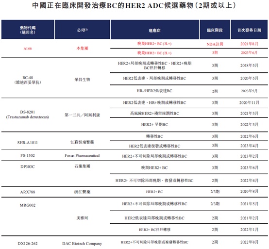 除A166外,截至最后实际可行日期,中国有两款获批HER2 ADC(基因泰克的赫赛莱®和第一三共的Enhertu®)及8款处于2期或以上阶段的HER2 ADC。