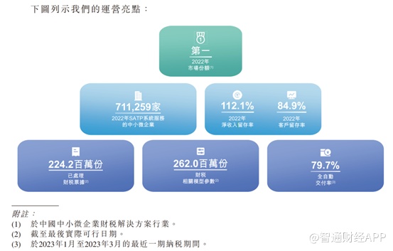按2020年、2021年及2022年总收入计算,慧算账是中国最大的中小微企业财税解决方案提供商,2022年的市场份额是第二大参与者的近四倍。根据同一资料来源,2022年,公司是中国中小微企业财税解决方案行业中直接服务中小微企业客户最多的公司。公司的核心业务是依托其自研的SATP系统,为中小微企业解决财税问题。公司旗下的SATP系統所服务的中小微企业数量达到71.13万家。2022年公司的客户留存率达到84.9%,净收入留存率112.1%,根据弗若斯特沙利文的资料,这一水平远高于行业的60%至70%。