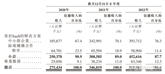 分业务来看,公司主要由基于SaaS的解决方案和专业服务量大业务构成。其中,基于SaaS的解决方案是公司的主要收入来源,2020年至2022年,该业务收入分别为2.50亿元、3.09亿元及4.53亿元,分别占总收入的90.9%、89.0%及87.7%。直接服务的中小企业付费客户从2021年12月31日的13.45万家,增至2022年12月31日的17.12万家。尽管专业服务收入占比较低,但近年来收入占比呈现逐年提升的态势,因此专业服务业务若能持续发力,也有利于公司摆脱单一业务独大的局面。
