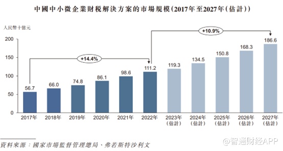 得益于庞大的中小微企业,中小微企业财税解决方案行业也大幅增长,市场规模由2017年的567 亿元增至2022年的1112亿元,复合年增长率为14.4%。沙利文预计中国中小微企业财税解决方案行业在2027年将达到1866亿元,2022年至2027年的预计复合年增长率为10.9%。
