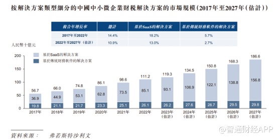 SaaS系统在中国中小微企业财税解决方案行业由传统纸质会计向数字化会计转型中发挥了重要作用。此转型在降低错误及欺诈风险的同时提升了效率及产能。基于SaaS的解决方案具有成本效益及效率,使解决方案提供商能够更精准地管理企业财务, 并消除对耗资高昂的IT基础设施及专业人员的需求。 中国中小微企业财税解决方案行业中基于SaaS的解决方案的市场规模由2017年的369亿元增至2022年的851亿元,复合年增长率为18.2%。基于SaaS的解决方案2022年的渗透率为76.5%。随着大数据及人工智能的持续发展,以及对高效且自动化解决方案需求的日益增加,预计中国中小微企业财税解决方案行业中基于SaaS的解决方案的市场规模于2027年将达到1568亿元,预计复合年增长率为13.0%。