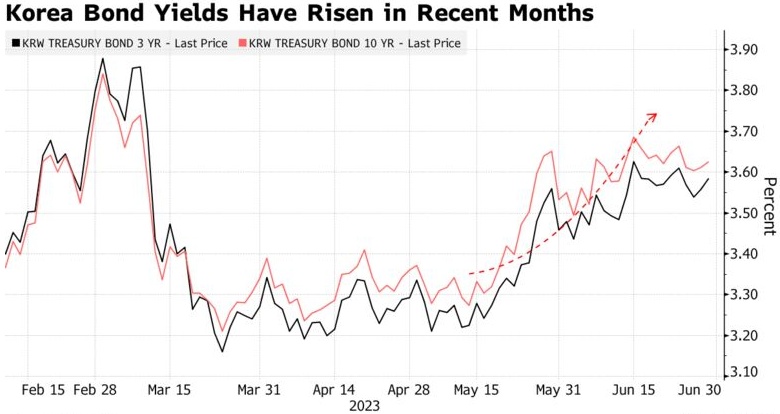 韩国3年期国债收益率上一季度上升约40个基点,掉期市场反映未来六个月不会降息。不过,这种情况可能会改变,周二公布的数据预计将显示,6月份消费者价格指数(CPI)同比涨幅从5月份的3.3%降至2.8%。