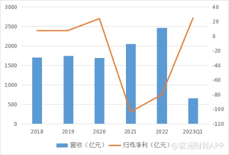 从近年业绩来看,在2018年至2022年间,公司营收整体呈现持续增长趋势,但在2021年净利大幅下滑,转盈为亏。2022年,公司营收为2467亿元,增长20.3%;净亏损约为73.87亿元,相对上年同期亏损的102.64亿元亏损幅度有所收窄。
