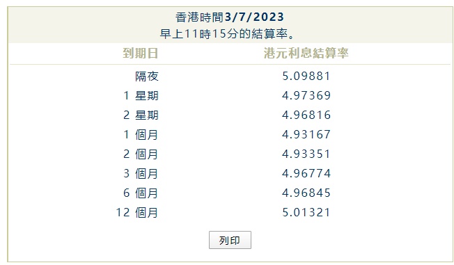 智通财经APP获悉,7月3日,半年结过后,港元隔夜拆息普遍下跌,其中,隔夜拆息由2006年1月以来新高,回落65基点至5.09881%,险守5厘水平。一周拆息亦跌至4.97369%,与楼按相关的一个月拆息降至4.93167%,创逾两周新低。