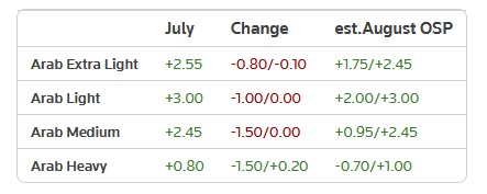 智通财经APP获悉,一项调查显示,亚洲炼油商预计,沙特阿美将在8月份将其旗舰阿拉伯轻质原油的官方售价下调约50美分/桶。其中一位受访者表示:“沙特需要削减价格以反映市场走势。在过去几个月里,他们离现实有点太远了。”