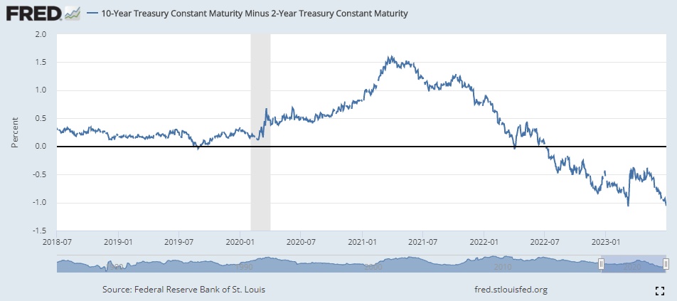 上周,2年期和10年期国债的收益率之一度急剧扩大到整整1个百分点,这是40多年来最大幅度的倒挂。