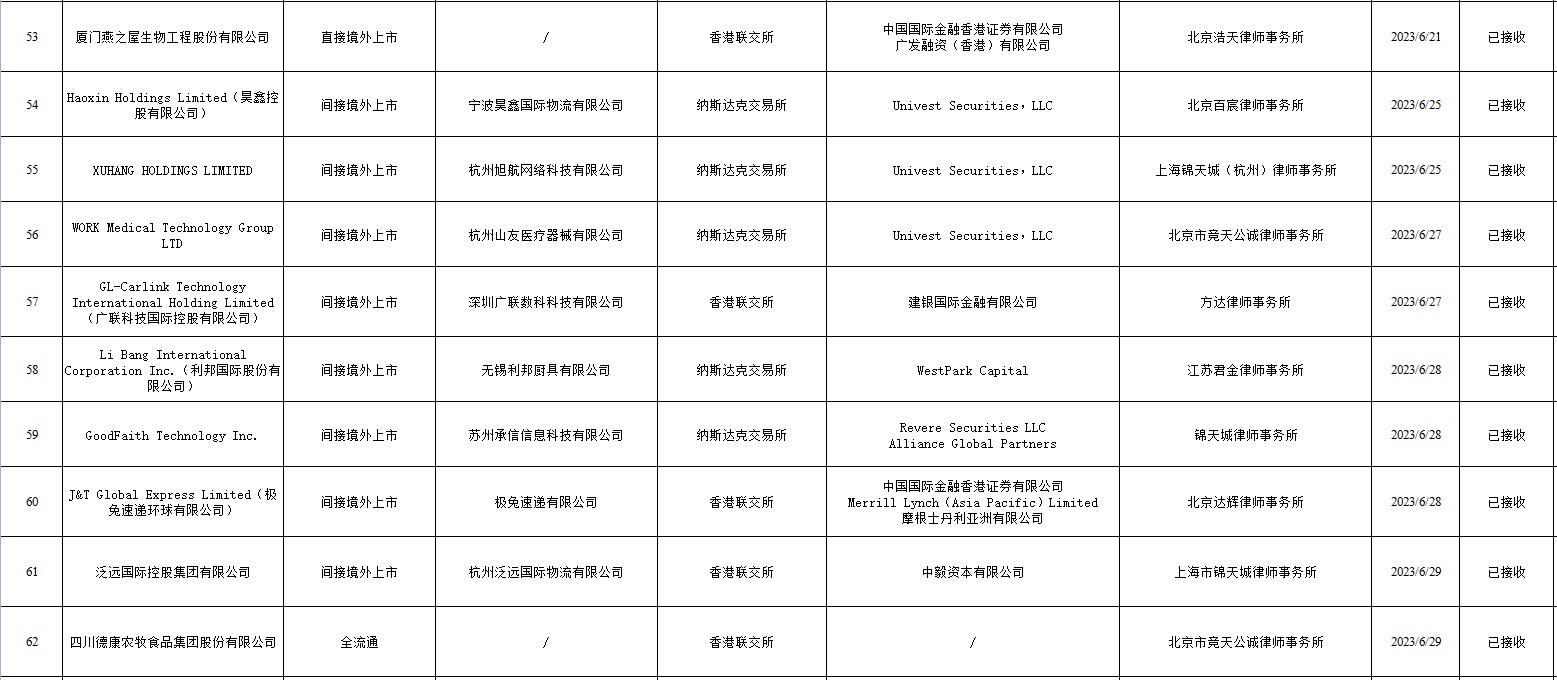 智通财经APP获悉,6月29日,中国证监会公布境内企业境外发行证券和上市备案情况表(首次公开发行及全流通),6月中下旬新增12家(5家美国IPO、6家香港IPO、1家全流通),截至目前已累计公布66家备案,当中包括备案制以来13家拟美国IPO上市公司在中国证监会备案,以及累计47家拟香港IPO上市企业备案(当中2家已取得备案通知书)、1家美国上市公司收购涉中国资产的备案、5家全流通备案。本周新增的12家具体如下: