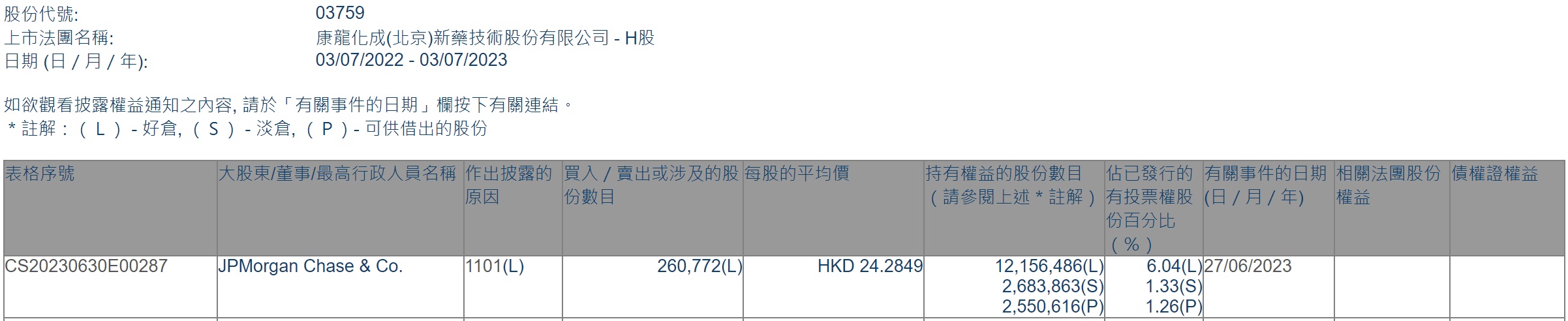 智通财经APP获悉,香港联交所最新资料显示,6月27日,小摩增持康龙化成(03759)26.0772万股,每股作价24.2849港元,总金额约为633.28万港元。增持后最新持股数目约为1215.65万股,最新持股比例为6.04%。