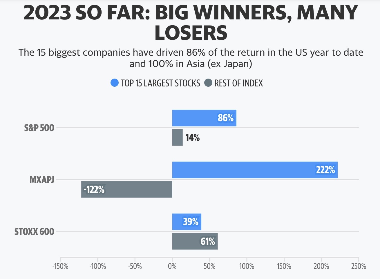 此外,标准普尔道琼斯指数(S&P Dow Jones Indices)高级指数分析师Howard Silverblatt的数据显示,标普500指数今年迄今15%的涨幅中,有7只股票的涨幅最大,且主要是受新生成人工智能技术的炒作推动。同时,高盛的另一种观点是:今年迄今为止,15家最大的公司推动了标普500指数86%的回报率。