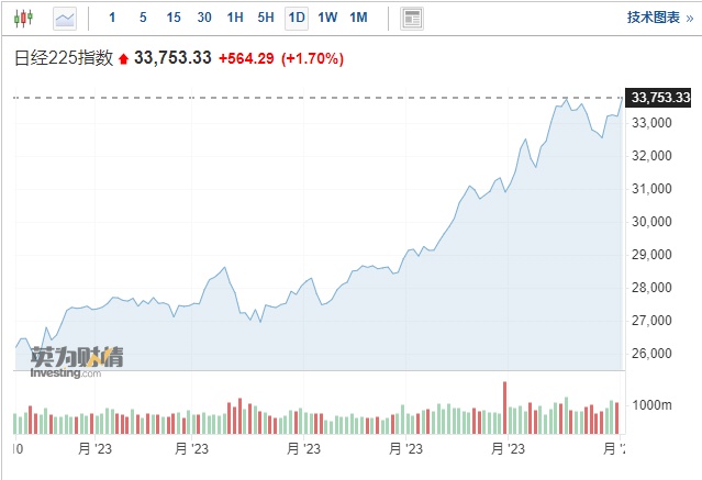 数据显示,日经指数收涨1.7%,至33753.33点,为1990年3月以来的最高收盘点位。东证指数上涨1.41%,至2320.81点。