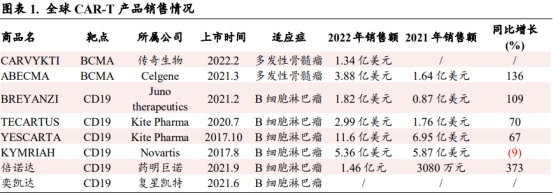 据智通财经APP了解,全球CAR-T产品在2022年大部分实现增长。FDA目前已批准6款CAR-T疗法,合计销售额达到27亿美元,较2021年的17亿美元增长明显。其中吉利德Yescarta在2022年的销售额达到11.6亿美元,同比增长达到67%,其是目前销售情况最好的CAR-T产品,也是首款年销售额超过10亿美元的CAR-T产品。而国内已公布的药明巨诺CAR-T产品也实现了1.46亿人民币收入,呈快速增长趋势。
