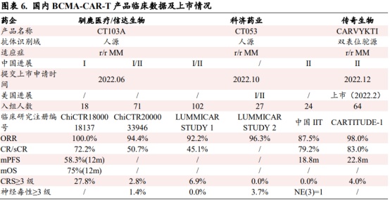 CT053的上市申请受理是基于一项在国内进行的名为LUMMICAR STUDY 1的开放、单臂I/II期临床试验。截至2022年8月16日,102例患者的中位随访时间为9个月,客观缓解率为92.2%,完全缓解率为45.1%;安全性方面,102例患者均报告了治疗相关的不良事件(AEs),AEs主要包括与清淋相关的血液学毒性,其中7例(6.9%)发生了3/4级细胞因子释放综合征。