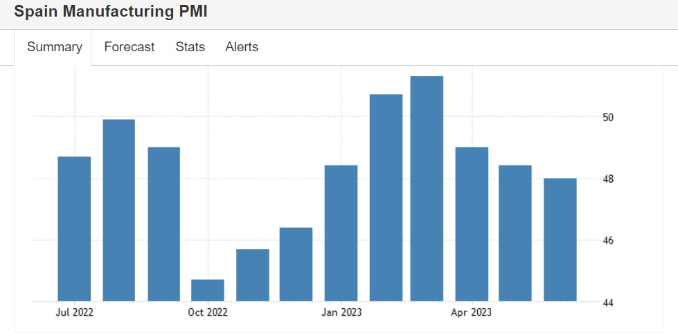 智通财经APP获悉,周一公布的一项调查数据显示,尽管欧盟救助资金的支出对资本货物产生了积极影响,但是欧洲重要经济体西班牙6月份制造业活动连续四个月萎缩。标普全球编制的HCOB制造业采购经理人指数(PMI)显示,西班牙PMI从5月份的48.4降至6月的48.0,但高于市场预期的47.7。指数低于50荣枯线表示经济收缩趋势。