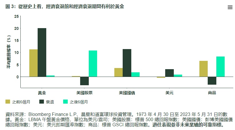 当前的领先经济指标已接近以往经济衰退期间的水平,环球和美国的增长趋势在通胀高企的情况下均发出放缓信号。美国经济是正在走向衰退抑或已经陷入衰退仍有待商榷。但需要强调的是,从历史上看,黄金不仅在经济萎缩期间表现良好,而且在紧接衰退之前的时期亦表现优异。