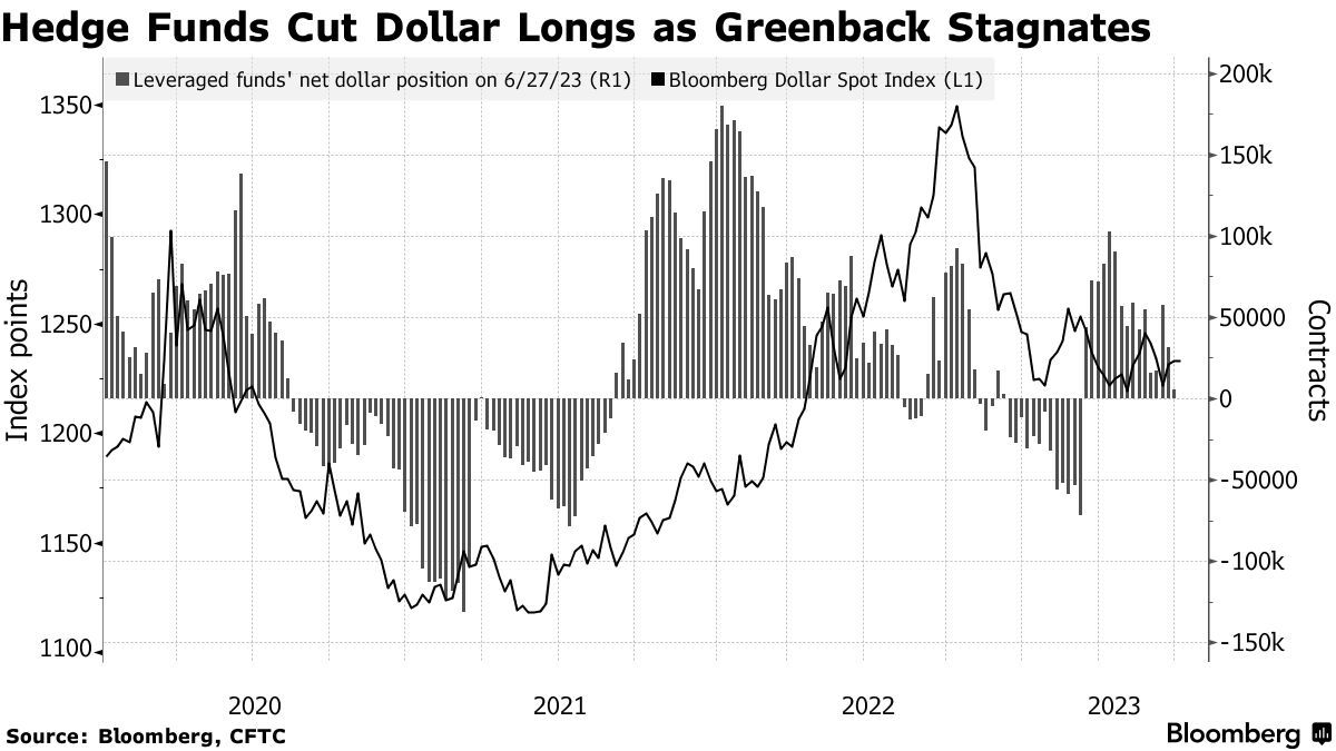 智通财经APP获悉,对冲基金似乎正准备好退出对美联储结束加息前景下的看涨美元押注,机构汇编的美国商品期货交易委员会(CFTC)统计数据显示,截至6月27日,衡量杠杆对冲基金对美元兑8种货币多头头寸的指标较一周前下滑逾五分之四。数据显示,美元多头合约数跌至5,196份合约,为3月7日以来的最低水平。