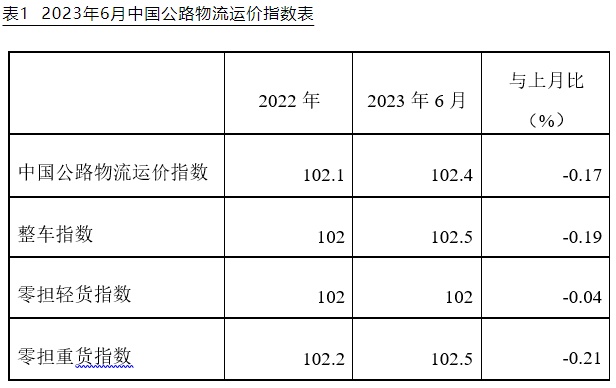 2023年6月份,由中国物流与采购联合会和林安物流集团联合调查的中国公路物流运价指数为102.4点,比上月回落0.17%,比去年同期下降0.32%。从周指数看,第一、四周运价指数环比回落,第二、三周运价指数环比回升。