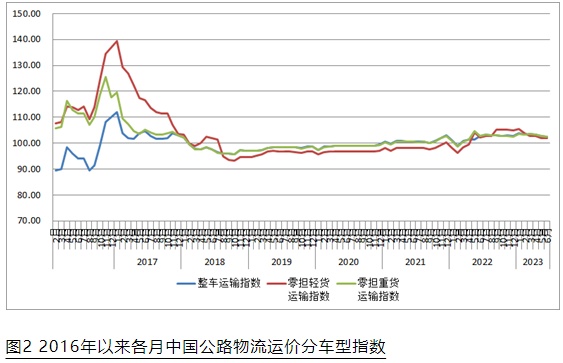 分车型指数看,各车型指数环比小幅回落,同比去年有所下降。以大宗商品及区域运输为主的整车指数为102.5点,比上月回落0.19%,比上年同期下降0.33%。零担指数中,零担轻货指数为102点,比上月回落0.04%,比上年同期下降0.26%;零担重货指数为102.5点,比上月回落0.21%,比上年同期下降0.33%。
