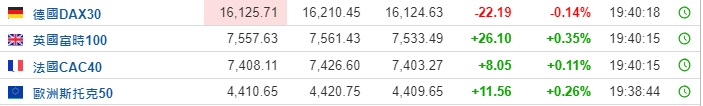 2. 截至发稿,德国DAX指数跌0.14%,英国富时100指数涨0.35%,法国CAC40指数涨8.05%,欧洲斯托克50指数涨0.26%。