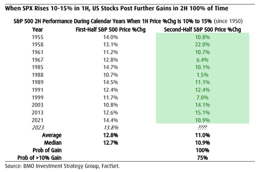 截至6月28日上周三收盘,标普500指数今年累计上涨14%。BMO策略师Brian Belski表示,自1950年以来,这种幅度的上涨是7月至12月强劲上涨的重要指标。