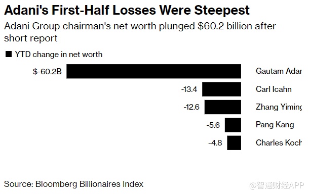 在这个半年期间,印度阿达尼集团的主席戈塔姆·阿达尼的财富下滑最为严重,损失了602亿美元。阿达尼在所有的亿万富翁中财富单日损失最多,他在1月27日一天就损失了大约208亿美元,因为做空他的公司的兴登堡研究公司指控他的企业集团存在会计欺诈和股票操纵行为。