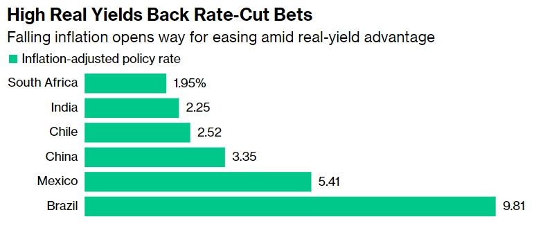这些策略师在一份报告中写道:“尽管低通胀可能证明新兴市场出现急转向宽松周期是合理的,甚至可以保持实际利率稳定,但这意味着名义利差大幅收窄,可能会让新兴市场本地市场容易受到冲击。这种前景可能有助于减缓降息的步伐,尽管关于它是否只是推动相同的最终利率还有更多的争论。”