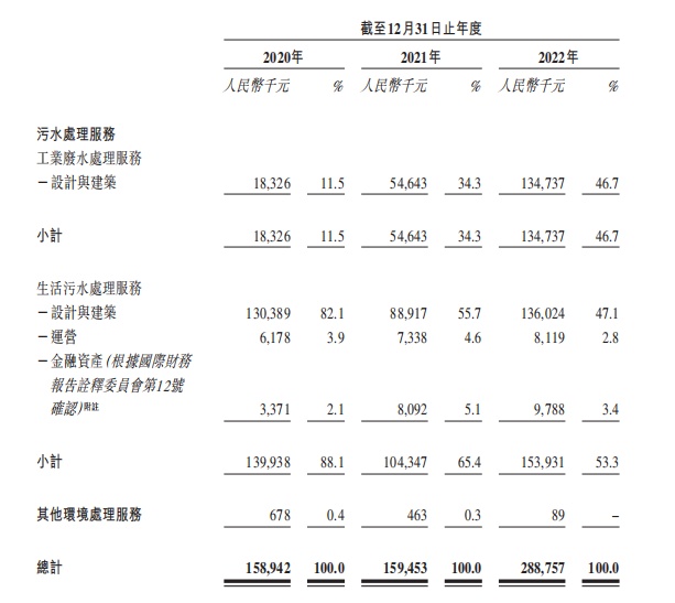 招股书显示,于最后实际可行日期,公司在安徽、河北亦有13个生活污水处理项目根据特许经营模式进行。此外,公司于往绩记录期完成22个生活污水处理项目的设计及建设工作。期内,来自生活污水处理项目的收益分别占总收益的88.1%、65.4%及53.3%。