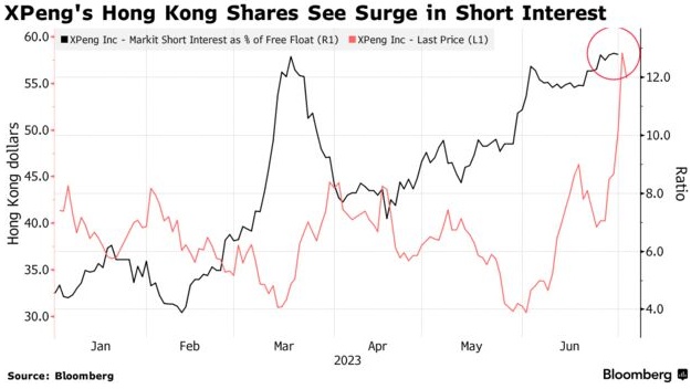 IHS Markit截至6月29日的数据显示,在小鹏在香港上市交易的股票中,空头头寸约占12%。小鹏的股价自6月1日的低点上涨了92%,达到超买水平,周二跌超5%。