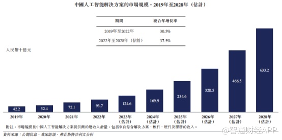 展望行业未来,人工智能赛道正迎来新的机遇,市场潜在空间广阔。根据弗若斯特沙利文的数据,在经济增长和客户需求不断变化的推动下,中国的人工智能解决方案市场从2019年的422亿元增加到2022年的937亿元,复合年增长率为30.5%,预计2028年将达到6332亿元,从2022年到2028年的复合年增长率为37.5%。