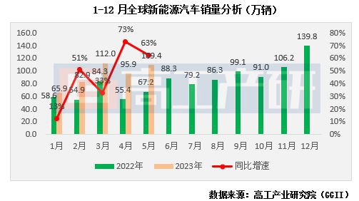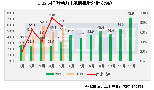 智通财经APP获悉,7月4日,高工产业研究院(GGII)通过发布的《全球动力电池装机量月度数据库》统计显示,2023年5月全球新能源汽车销量为109.4万辆,同比增长63%,1-5月全球新能源汽车累计销售466.1万辆,同比增长45%。相应的5月份全球动力电池装机量约55.7GWh,同比增长73%,1-5月全球动力电池装机量累计达238.5GWh,同比增长57%。