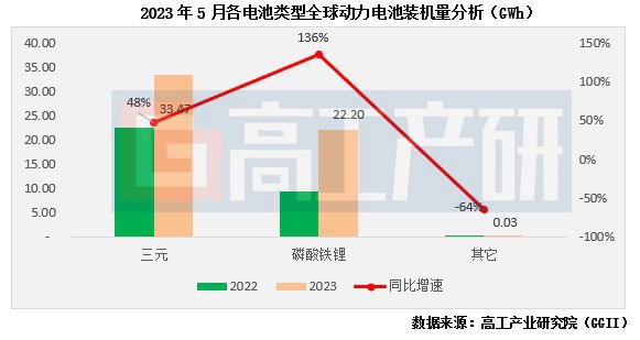 从全球各电池类型应用来看,5月份全球磷酸铁锂动力电池装机量约22.2GWh,同比增长136%,市场份额占比达40%,较去年同期提升10个百分点;三元动力电池装机量约33.47GWh,同比增长48%。