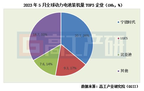 从竞争格局来看,5月份全球动力电池装机量排名前三企业分别为宁德时代、比亚迪、LGES,份额占比合计为67%。其中,宁德时代以20.1GWh装机量,占据全球36%的份额。
