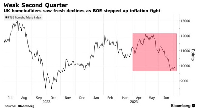 摩根大通发表上述观点之前,追踪英国住宅建筑商股票的富时指数第二季度下跌了约10%,原因是英国央行将主要利率上调至5%,给抵押贷款利率带来了更大的上行压力,并进一步加剧了英国的生活成本危机。
