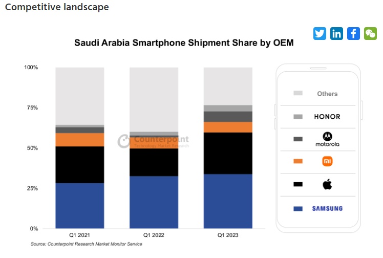 荣耀是第一季度出货量增长最快的品牌之一,其出货量同比增长了一倍多。荣耀手机出货的增长主要归功于专注的扩张努力、积极的发布活动以及有吸引力的中高端产品组合。荣耀也受益于华为早期的分销和渠道关系。2023年第一季度,该公司在沙特阿拉伯销量最高的手机是荣耀70和X系列。