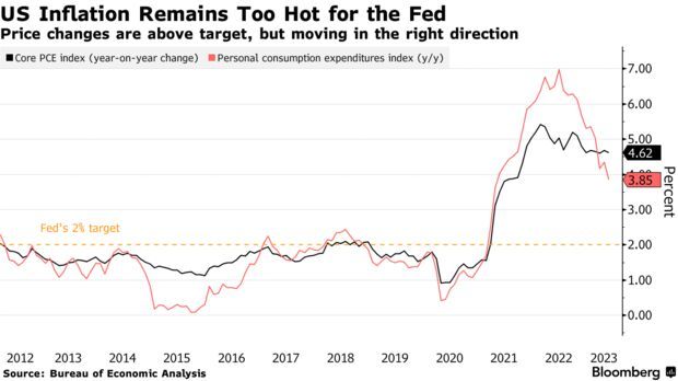 美联储将在7月政策会议前获得两份重要的经济数据:本周五公布的美国6月非农就业数据和7月12日公布的美国6月CPI数据。美国商务部上周五公布的数据显示,美国5月PCE物价指数同比上涨3.8%,受美联储青睐的5月核心PCE物价指数则同比上涨4.6%。与此同时,美国5月个人支出仅环比增长0.1%,远低于前值0.8%,这表明美国经济的主要引擎开始失去一些动力。