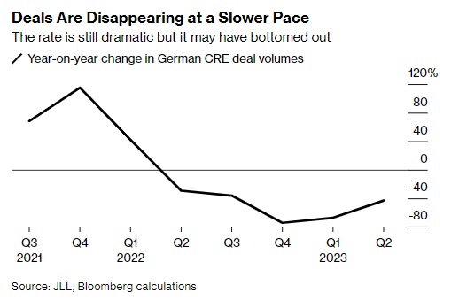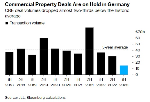 智通财经APP获悉,最新数据显示,德国商业房地产市场的交易额跌至至少2017年以来的最低水平,这是利率飙升引发动荡的最新迹象。根据房地产服务公司仲量联行提供的数据,2023年上半年的交易额比前六个月下降了50%,降至149亿欧元(162亿美元)。这一数字比过去五年的平均水平低了约三分之二。