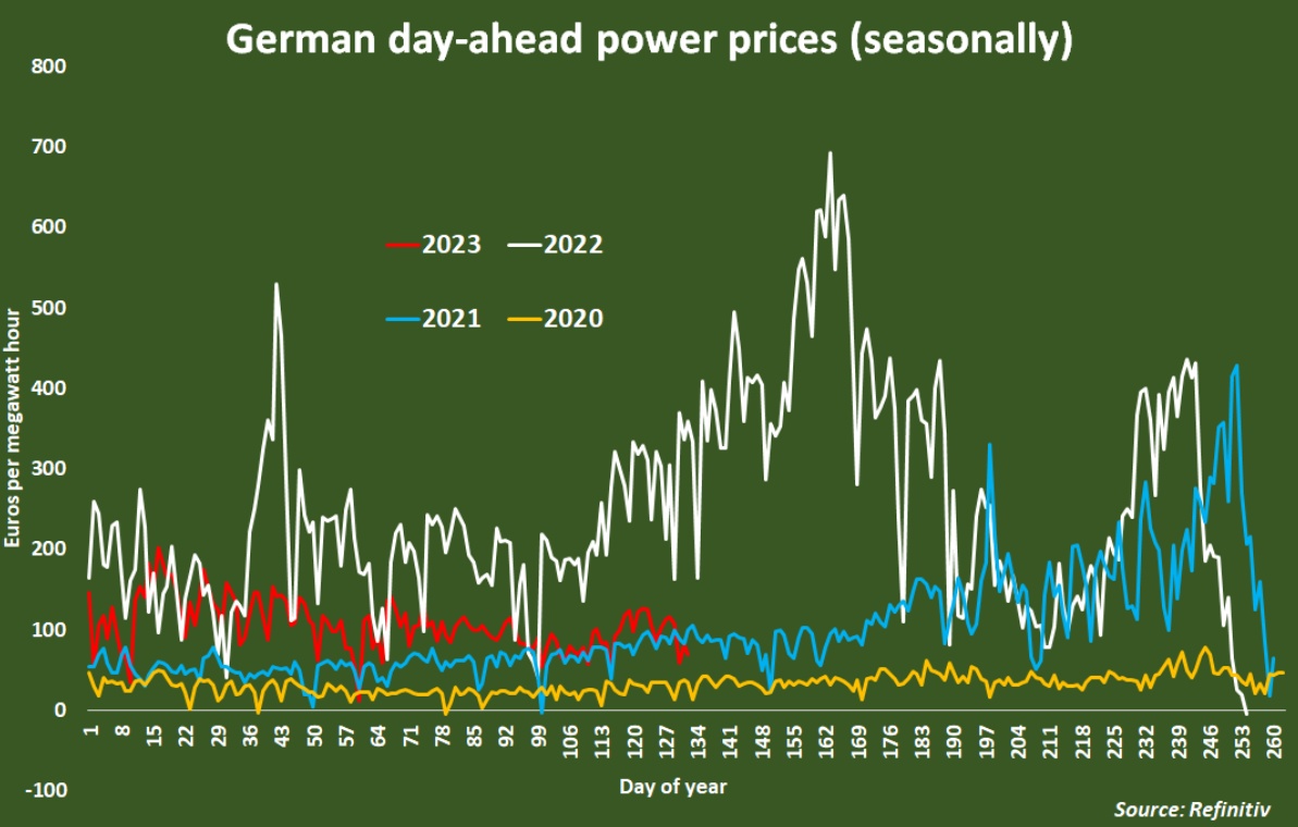 数据显示,德国在7月初的电价是2022年峰值的十分之一,目前已低于2021年同期的水平——这是俄乌冲突爆发后俄罗斯切断天然气供应并引发整个欧洲的电力成本飙升前的水平。