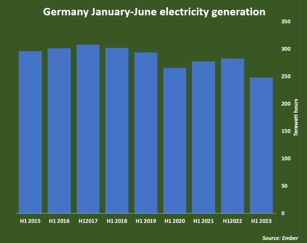 尽管电价较峰值持续走低,但德国上半年的总发电量为247太瓦时,比2022年同期的282太瓦时低12.4%。