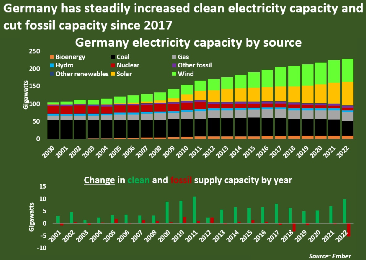 智库Ember的数据显示,2022年,德国公用事业公司的太阳能供应产能增加了创纪录的12%,风力发电能力增加了近4%,这将整体清洁能源发电产能提高了近7%,达到创纪录的156千兆瓦。