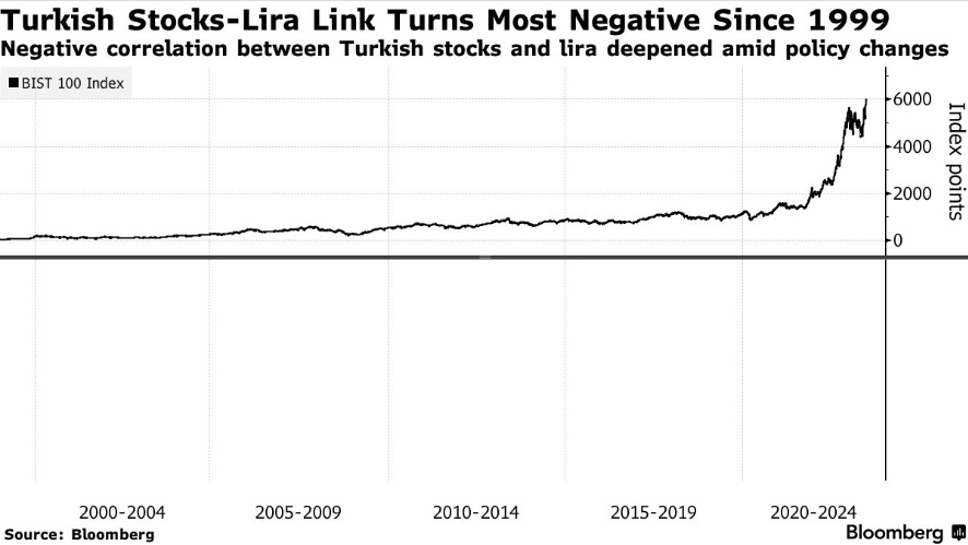 智通财经APP获悉,土耳其的货币和股市出现了25年来最严重的脱钩,原因是当地和外国投资者对该国回归正统政策的反应不同。据了解,在土耳其央行两年来首次加息低于预期、当局暂停了对里拉的保护之后,里拉跌至创纪录低点。与此同时,在通胀率接近40%的情况下,股市创下新高,促使土耳其公民将股市作为价值存储手段,从而导致这两种资产之间的相关性从历史上的正相关变为自1999年以来的最负相关。
