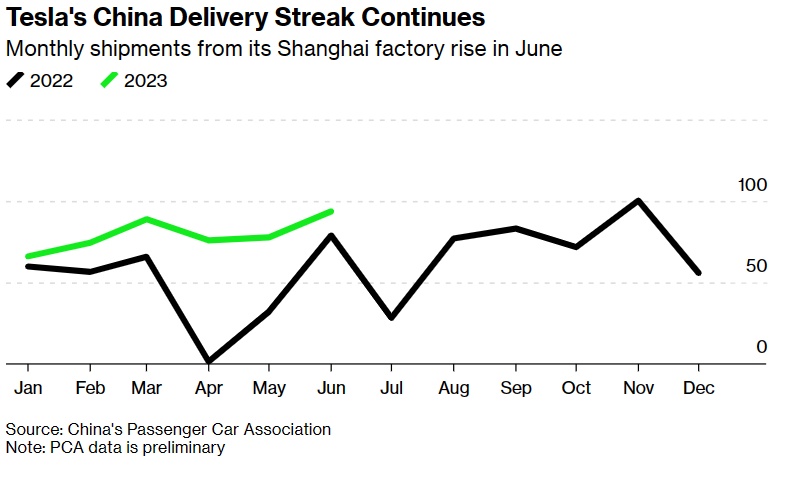 特斯拉在中国市场的竞争对手紧紧跟随这家电动汽车先驱积极降价的步伐,在经历了4月份上海车展期间的一段混乱时期后出现了增长。比亚迪股份有限公司(BYD Co.)与理想汽车(Li Auto Inc.),以及广汽集团(Guangzhou Automobile Group Co.)旗下的Aion 6月份的汽车交付量均出现反弹,并创下了月度销量记录。