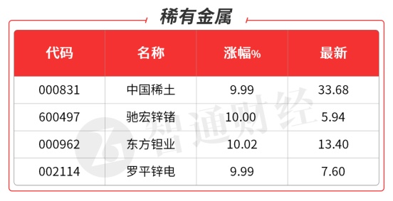 小金属稼和锗的出口管制刺激稀土、有色等周期股集体走强,昨天提到的云南锗业(002428.SZ)、光智科技(300489.SZ)获20CM涨停,福达合金(603045.SH)均晋级2板;首板有东方钽业(000962.SZ)、驰宏锌锗(600497.SH)昨日炸板今日反包,罗平锌电(002114.SZ)。稀土永磁板块受到了相关言论的刺激。银河磁体(300127.SZ)、中科磁业(301141.SZ)获20CM涨停;中国稀土(000831.SZ)、创兴资源(600193.SH)涨停。当前这个板块受消息影响较大,关注形势的进一步发展。