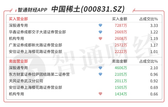中国稀土(000831.SZ):多主力现身龙虎榜,机构席位对倒净买入1174万元,深股通对倒净买入2682万元,买二是知名游资的席位买入2669万元,当日净买入6814万元,该股今日反包,预计压力在半年线附近。