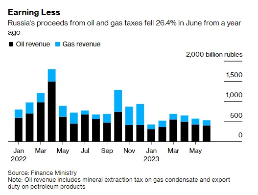 智通财经APP获悉,由于原油价格下跌和欧洲天然气供应受限,俄罗斯上月油气收入缩水逾四分之一。俄罗斯财政部表示,6月来自石油和天然气税的预算收入同比下降26%,至约5290亿卢布(合58.4亿美元)。其中,天然气税的预算收入下降了54%,至1257亿卢布,而原油和石油产品的收入(占碳氢化合物收入的76%以上)下降了近十分之一,至4028亿卢布。