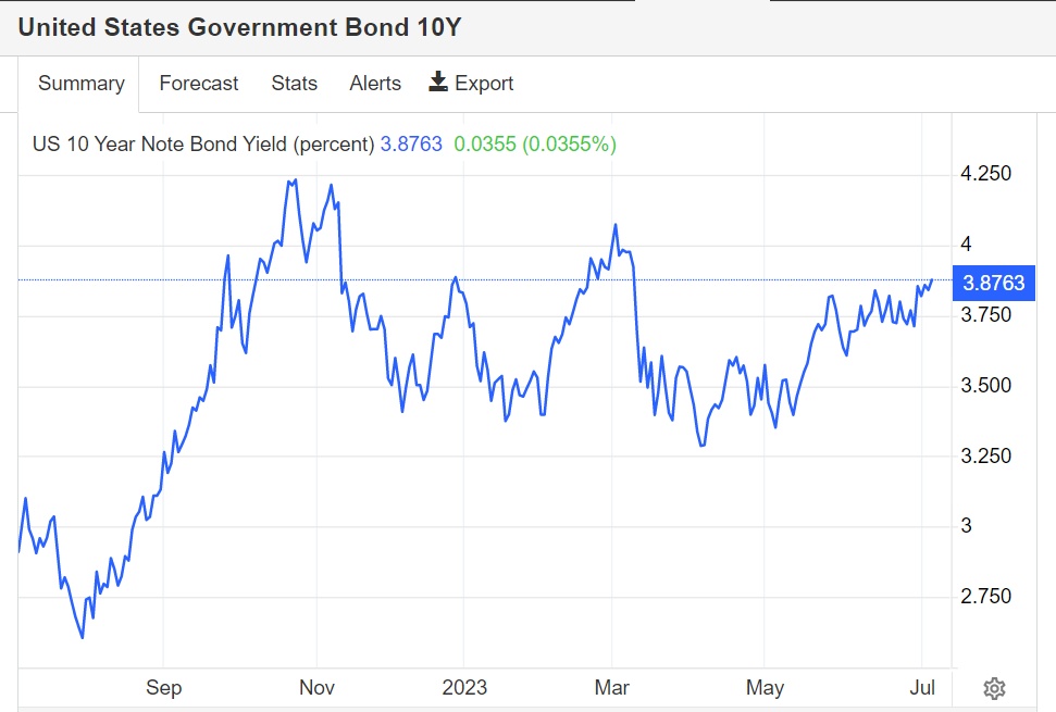 这种风险上周成为关注的焦点,6月29日公布的就业和GDP经济数据意外强劲,推动美国较短期的国债收益率创下3月以来最大的单日涨幅之一(价格变动与收益率变动呈现反向趋势)。此外,随着市场对美联储加息预期近期升温,有着“全球资产定价之锚”的10年期美债收益率近日随加息预期迅速攀升,目前该收益率已升至3月美国银行业危机以来最高点。
