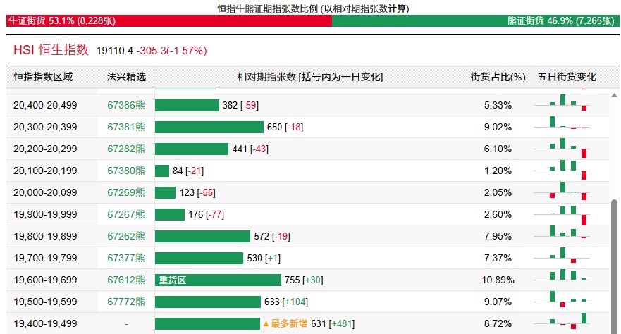 法兴恒指牛熊证街货分布图中的数据显示,熊证街货重货区在19600-19699区间,该区间最新熊证数量为755张,较上一交易日增加30张;最多新增在19400-19499区间,该区间最新熊证数量为631张,较上一交易日增加481张。